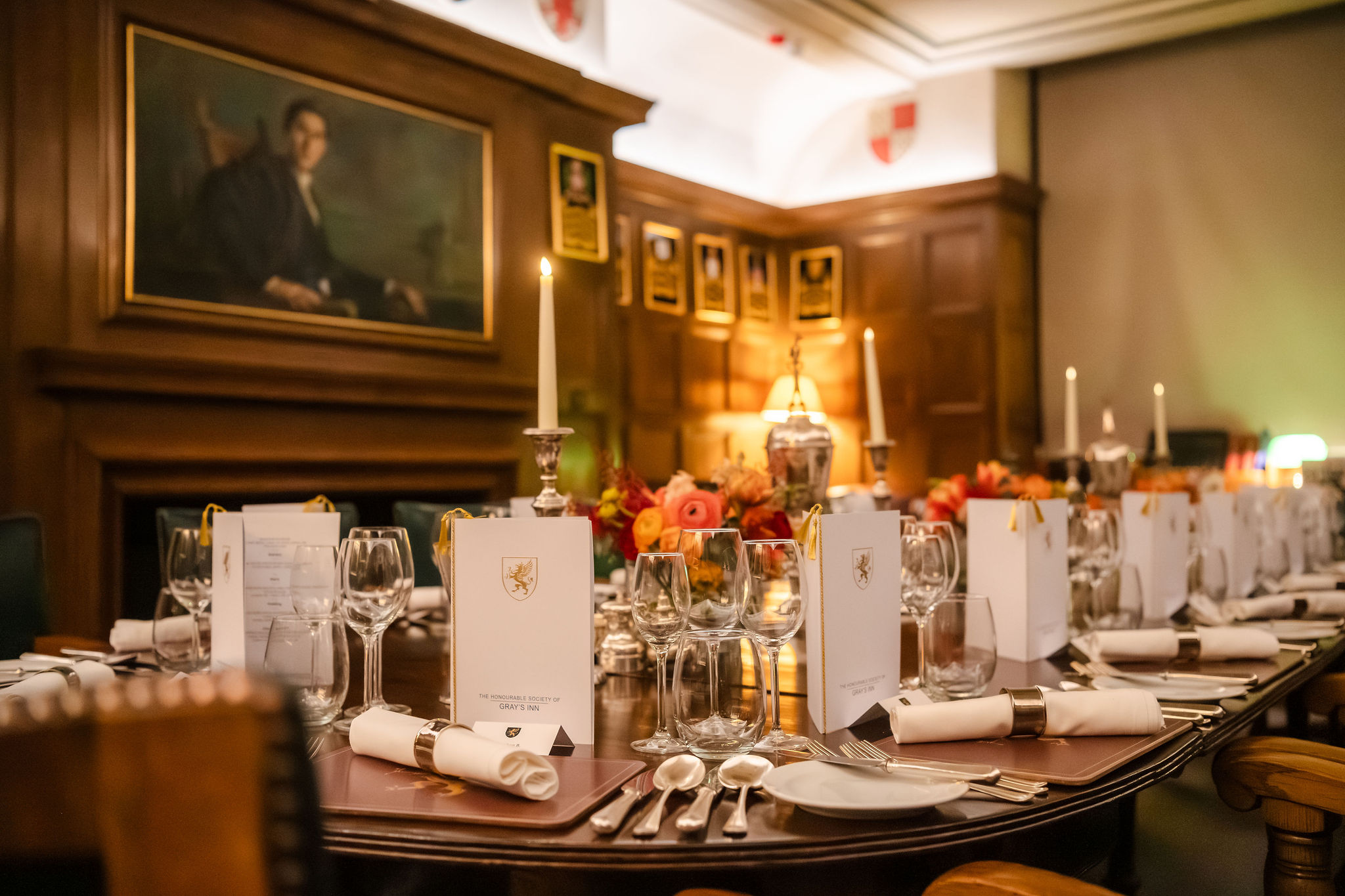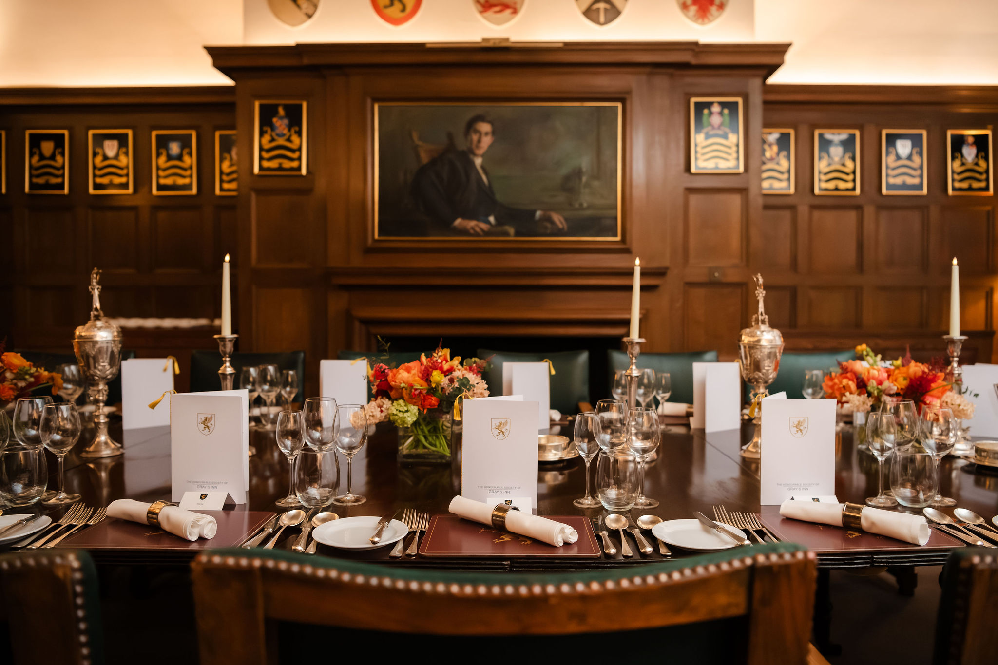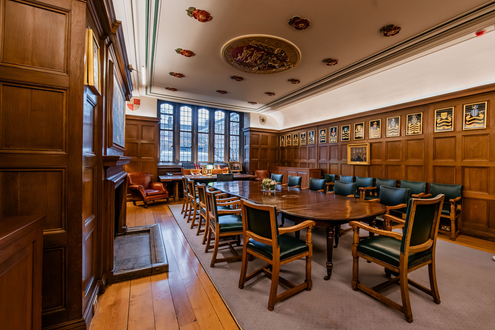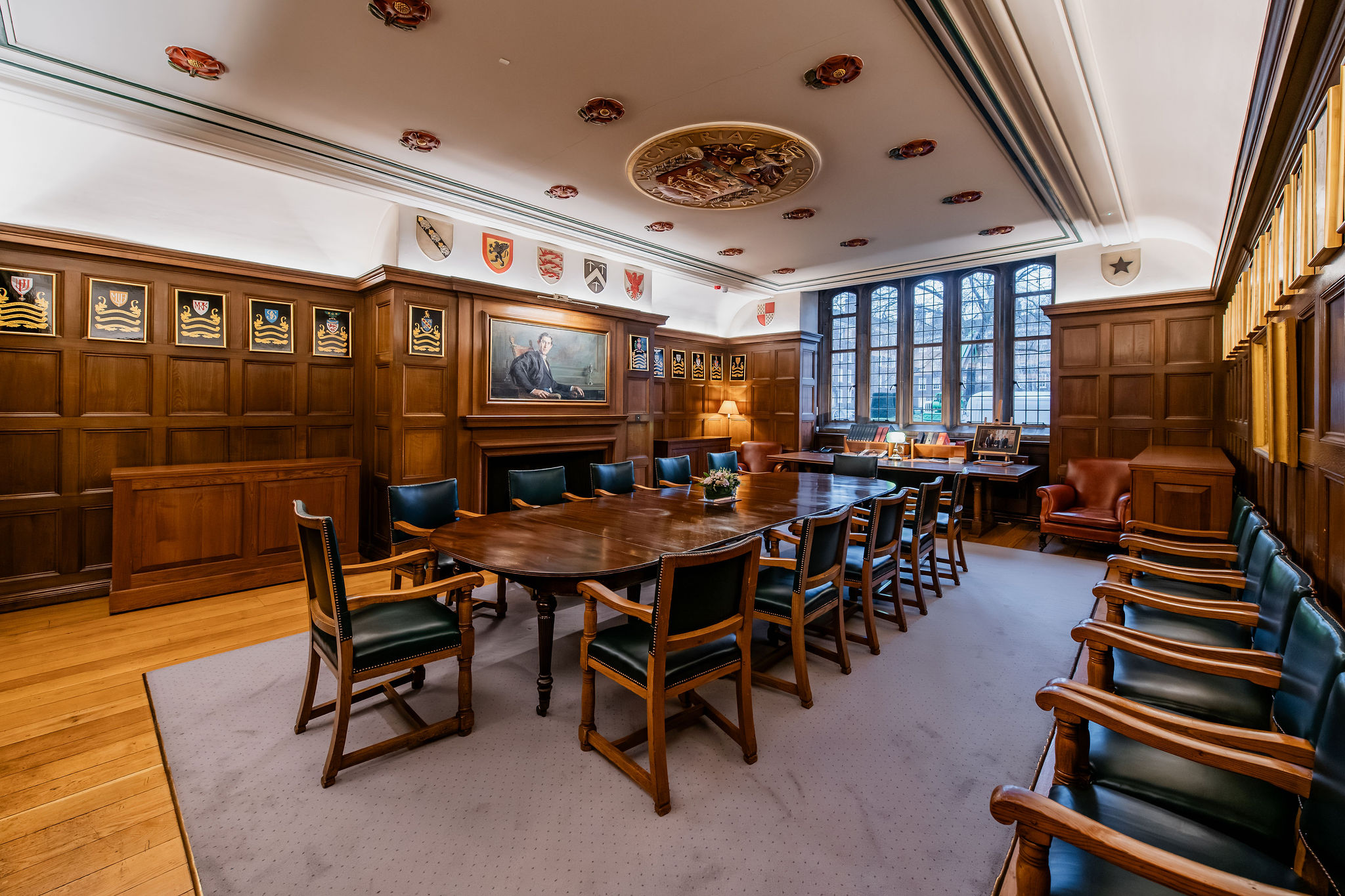 Located on the first floor of the Domus Building, the Small Pension Room offers an elegant and welcoming setting that is perfect for intimate dinners. Set within a traditional space, it features oak-panelled walls, a striking mahogany table and a beautifully detailed ceiling adorned with classic rose motifs.