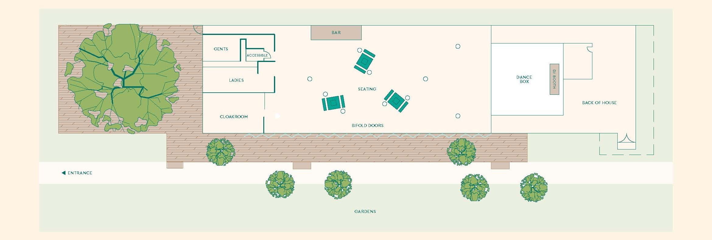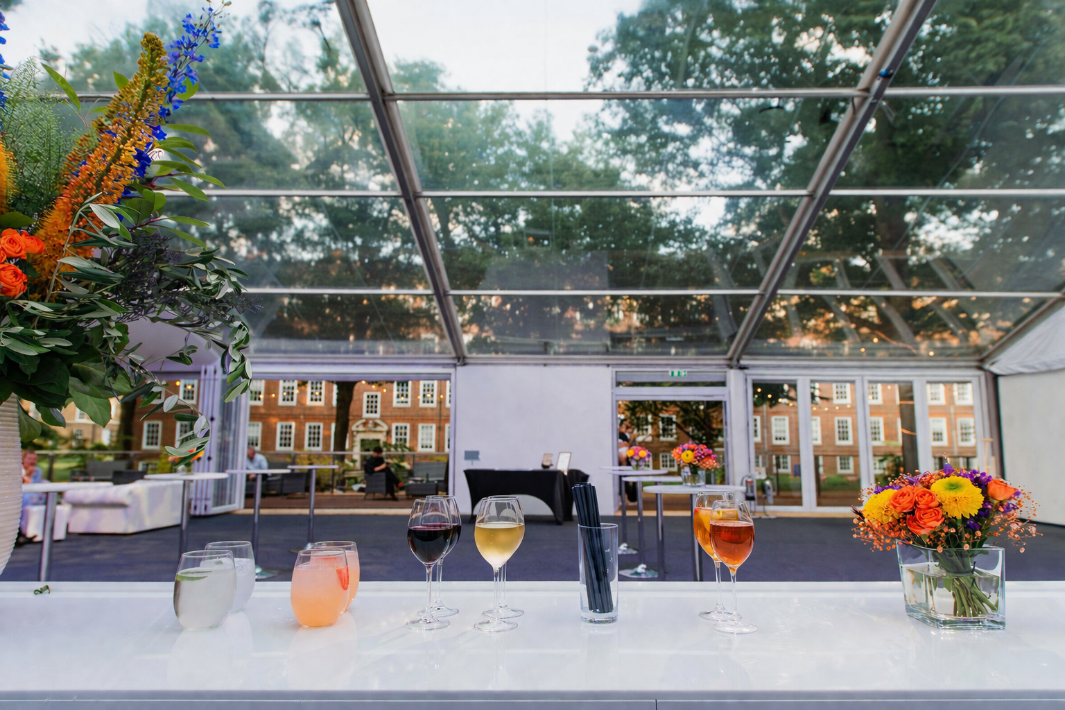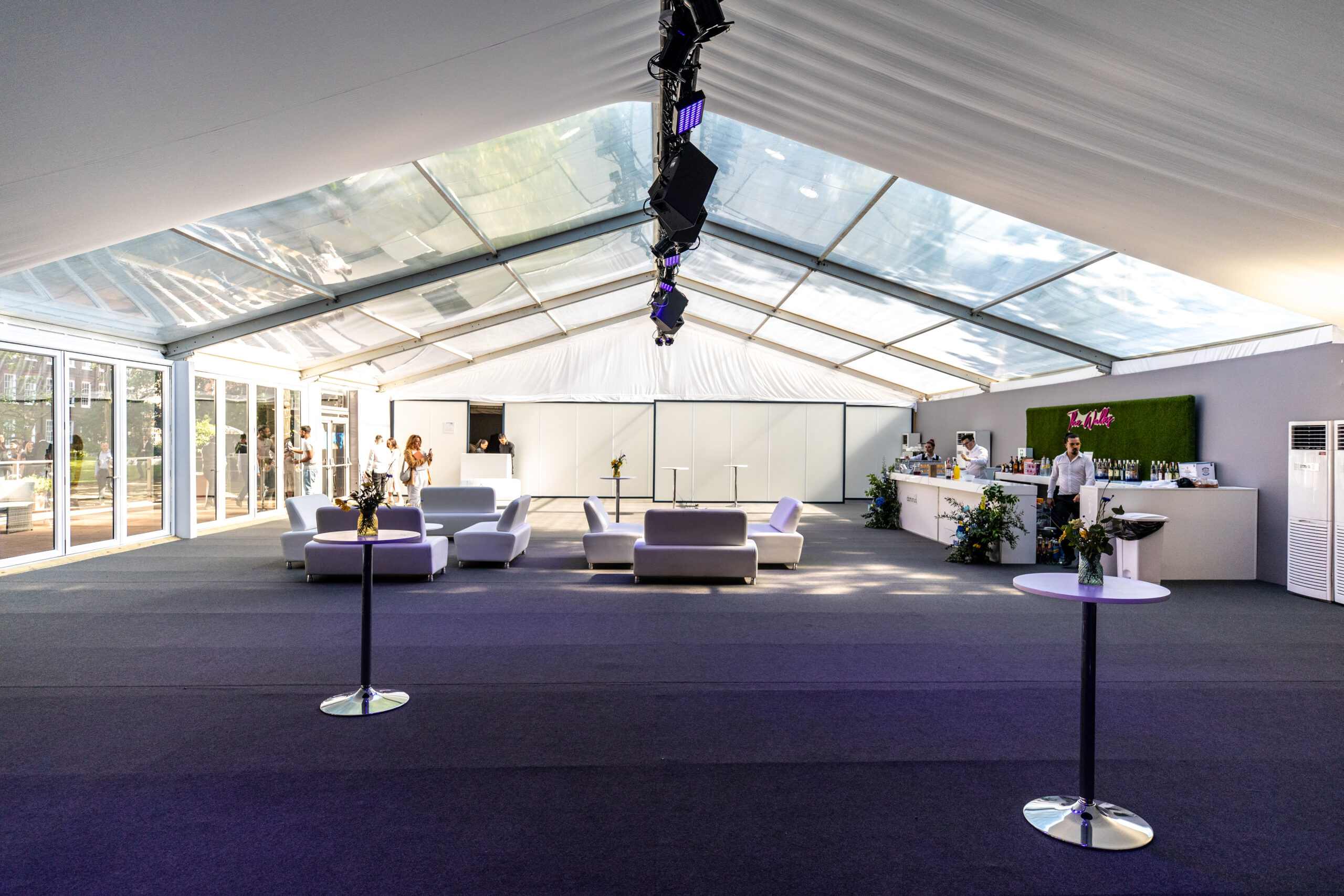 The marquee includes air-cooling, a dancefloor, restrooms, an integrated feature bar and a newly extended terrace with a second bar to improve event flow. Together, these elements create a comfortable and well-equipped setting for summer parties, corporate events, garden parties and receptions.